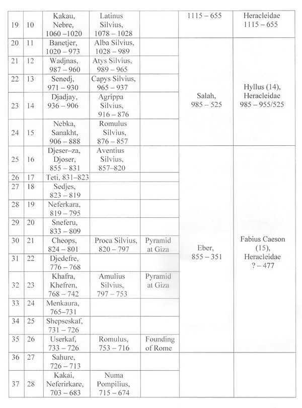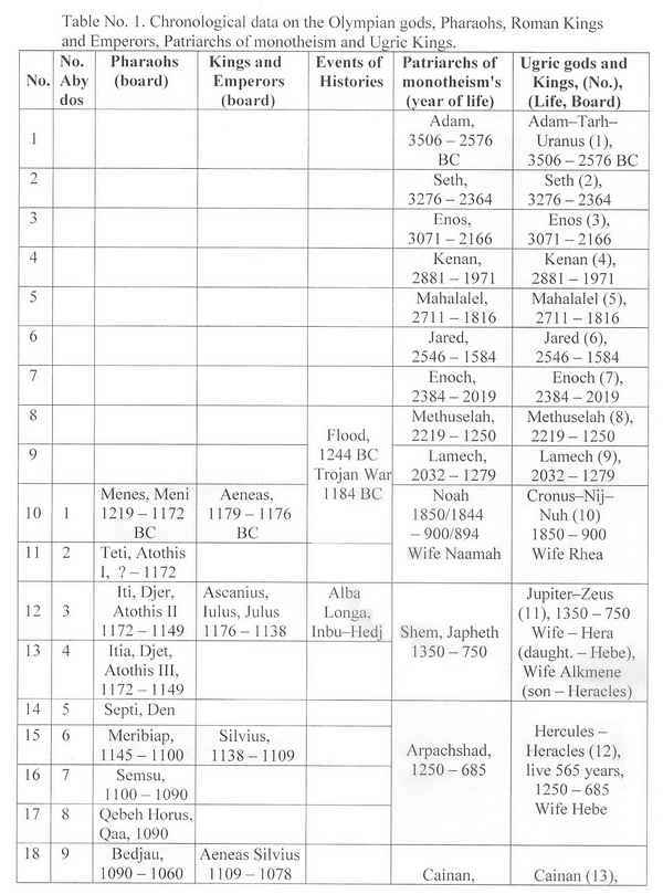 The results of our reconstruction of the ancient history and chronology of monotheistic religions are summarized in Table No. 1. The first column is the serial number of historical figures, including Patriarchs, Pharaohs, Kings and Emperors of Rome, Patriarchs of Islam and Ugric Kings. The second column is the numbers of the Pharaohs on the Abydos list. This is followed by a column of known names of Pharaoh. The fourth column is the Roman names of Pharaohs, Emperors or Kings, as well as the years of their board. In the fifth column indicate information about significant events that occurred during the reign of the Pharaoh or King. In the sixth column we will indicate the names of Biblical and Islamic Patriarchs and the years of live. In the last column we will write the names of the Ugric Kings, the current number, as well as the duration of their life and board. Light gray background in the fields of the table we note the coinciding historical and Biblical personalities, and a darker gray background – the identified personalities of Pharaohs, Kings, Emperors and Patriarchs.