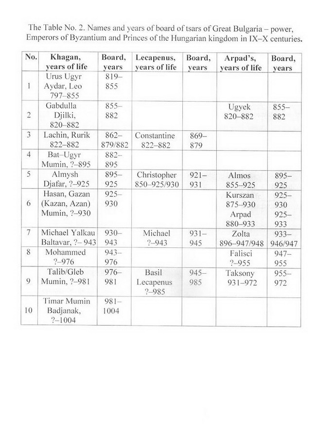 Urus Aydar was the ancestor of the Saklan dynasty of Volga Bulgaria [9], the Russian Rurik dynasty, the dynasty of the Lecapenus and the Arpad dynasty [17] in Hungary (the Table No. 2). Identified persons are indicated in gray in the Table. |