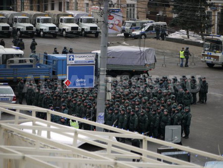 Оцепление Пушкинской площади вооруженными солдатами внутренних войск: