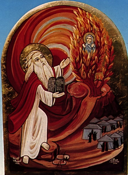 | Икона XIX века. Пророк Моисей смотрит на Неопалимую Купину с Богородицей внутри: