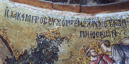67. Люди, несущие саркофаг 80. Элеоуса Марии Фигура 1. При входе в храм мы видим Иисуса Христа Пантократора (Вседержителя), наружный нартекс. В его левой руке Священная книга. Правой рукой Иисус благословляет людей. Вокруг головы нимб и надпись «Иисус Христос, прибежище живых» (IC XC HXѠPA TѠN ZѠNTѠN). Мы видим, что утраченные буквы на мозаике дописаны черной краской.