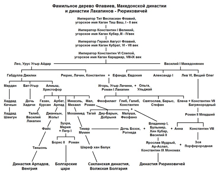 | Выводы нашего исследования: Мы проанализировали даты жизни и биографии нескольких сотен исторических личностей, живших в первом тысячелетии нашей эры и строивших мировую цивилизацию Древнего Рима и Нового Рима, а также королевства Венгрии, Болгарии, Волжской Болгарии и России. Часть императоров Древнего Рима были этническими уграми из Поволжья (гаплогруппа N1), царями кочевых и оседлых народов Поволжья, Северного Кавказа, Причерноморья и Балкан. Мы доказали, что Рюриковичи являются ветвью римских императоров Флавиев, потомками императоров Тита Веспасиана Флавия, Константина Великого, Ираклия и Константина VI Слепого, как и все члены Македонской династии. В X веке потомки Рюрика – Лачина и старшая отрасль Рода Руси, идущая от старшего брата Рюрика по имени Габдулла Джилки, в Константинополе назывались Лакапины – близко родственная ветвь Македонской династии. Армянская версия происхождения указанных династий является поздней фальсификацией.